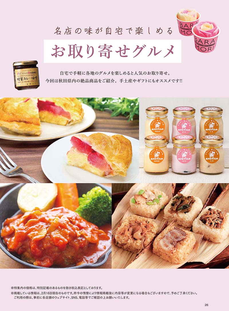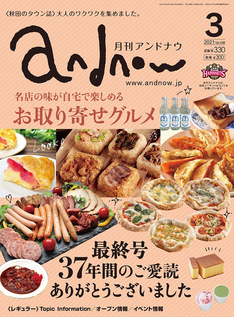 最終号の特集は「名店の味が自宅で楽しめる お取り寄せグルメ」。コロナ禍で需要が高まっっているお取り寄せ、秋田県内にも全国から注文が殺到している美味しさがたくさんあります。知名度は全国区、でも地元だからこそあんまり味わったことなかったなぁ〜なんて商品をこの機会に楽しんでみませんか?ネットで気軽にポチッと注文してもよし、お近くにお住いの方は直売所や店舗に直接行ってもよし。秋田が誇る味わいを要チェック!